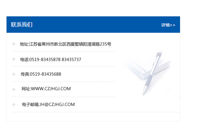 傳真:0519-83435688    郵編:213135    網址:WWW.czjhgj_com.gzjz88.com    電子郵箱:JH@czjhgj_com.gzjz88.com